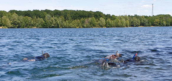Bevor wir auf dem Steg die letzten Utensilien (Füßlinge, Flossen, Kopfhauben, Handschuhe, Masken und Schnorchel) angelegt haben gab es eine Lagebesprechung. Wie ist der See beschaffen, in welche Richtung werden wir unsere Erkundung angehen und was kann uns auf dem Weg erwarten.