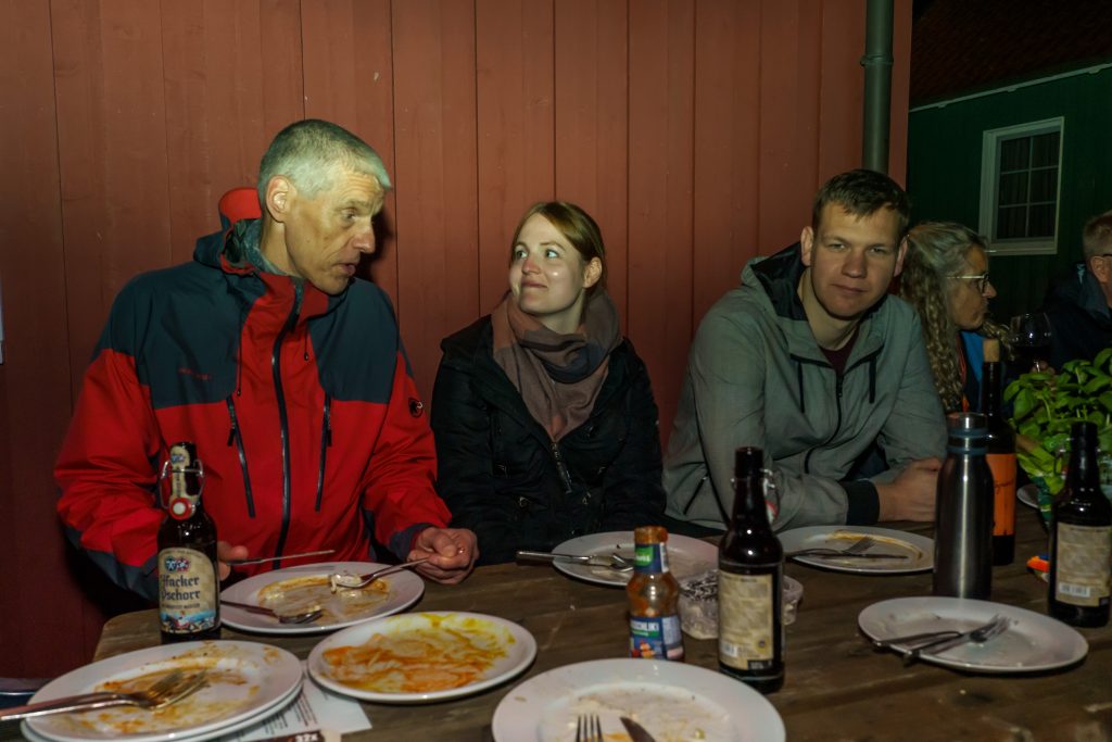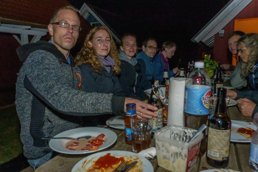 Am Abend ging es in kleinen Gruppen zum Abendessen. Am vorletzten Abend organisierten wir gemeinsam einen Grillabend, so dass wir eine lange Tafel mit allen 13 Taucher*innen und Begleiterinnen hatten.