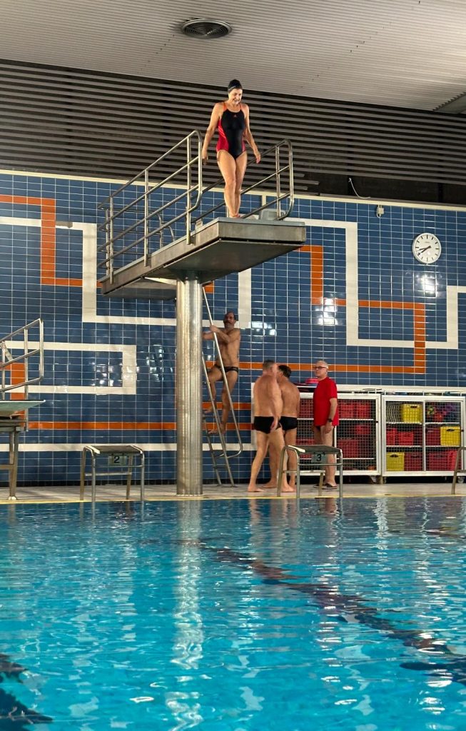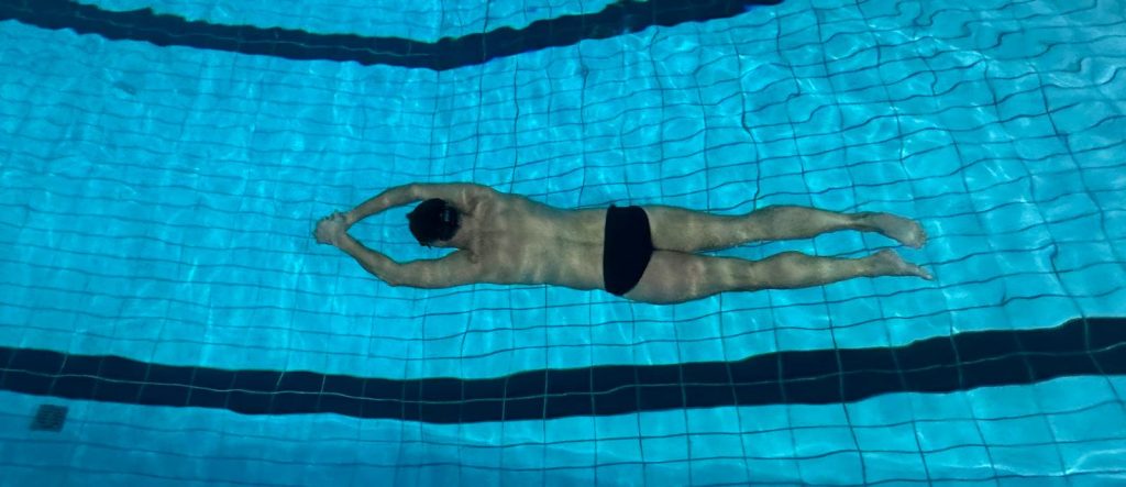 Kombinierte Übung, die ohne Pause in der angegebenen Reihenfolge zu erfüllen ist: Sprung kopfwärts ins Wasser; 20 m Anschwimmen in Bauchlage;