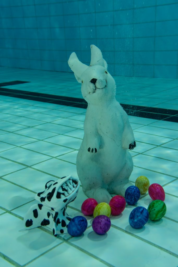 Natürlich, der bekanntermaßen auch unter Wasser agierende aber extrem selten zu Gesicht bekommende Osterhase! Hier hat es funktioniert! Beim Sortieren seiner „Ostergaben“ wurde eins dieser ganz seltenen und scheuen Exemplare beobachtet und mit dem o.g. neuen Equipment für uns alle sichtbar festgehalten.