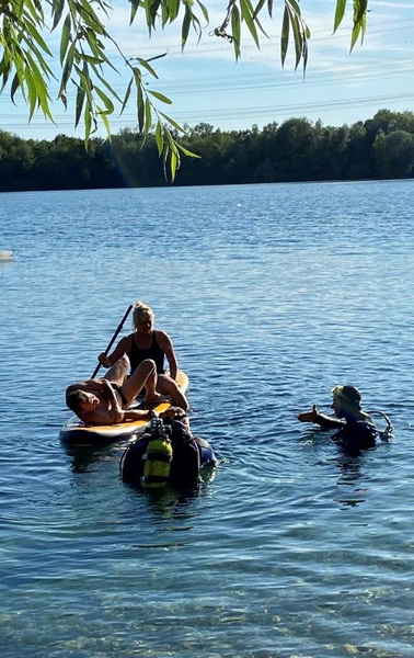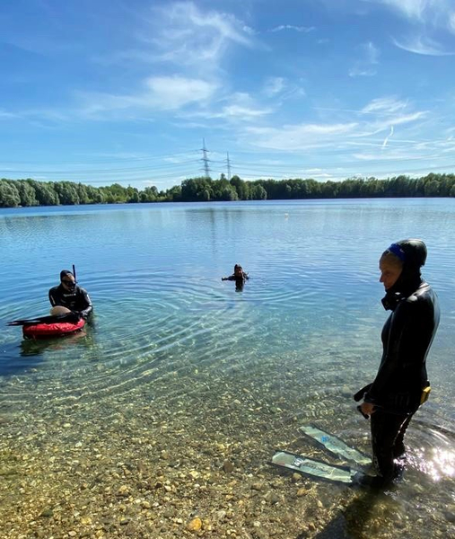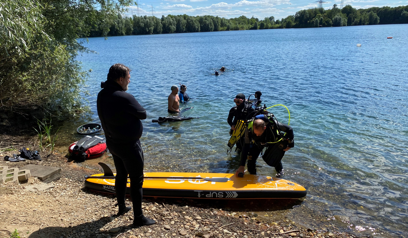 Warum ist dieser Platz so besonders? Er ist ein wenig abgelegen, sodass wir den ganzen Tag unter uns waren, ohne das andere Taucher vorbeigekommen sind. Auch die parkenden, rangierenden Autos waren weder zu hören noch zu sehen. Darüber hinaus ist dort ein ebenerdiger, flacher Einstieg, um z.B. auch Anfängern das Stand-Up-Paddling zu ermöglichen. Was NATÜRLICH ein wenig unterlaufen wird, wenn Gerätetaucher (Namen werden hier nicht genannt) versuchen im Wasser einen vom Brett zu holen.