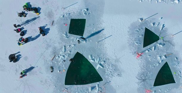 Neben dem Apnoetauchen mit und ohne Flossen, bekamen wir zusätzlich die Möglichkeit in dieser surrealen Umgebung auch die Alternative „mit oder OHNE Neopren“ zu ergreifen, um uns unter der Eisfläche zu bewegen. Und ja, ich bin auch zweimal ohne Neopren und ohne Flossen rein, am ersten Tag nur um sehen wie kalt es ist und wie man dann wieder rauskommt, und am zweiten Tag bin ich dann auch eine kurze Strecke unter dem Eis getaucht. Das „ohne Neopren“ macht sich vor allem am Kopf bemerkbar und ohne Flossen ist auch der Ausstieg nicht ganz einfach – zum Glück gab es immer helfende Hände!